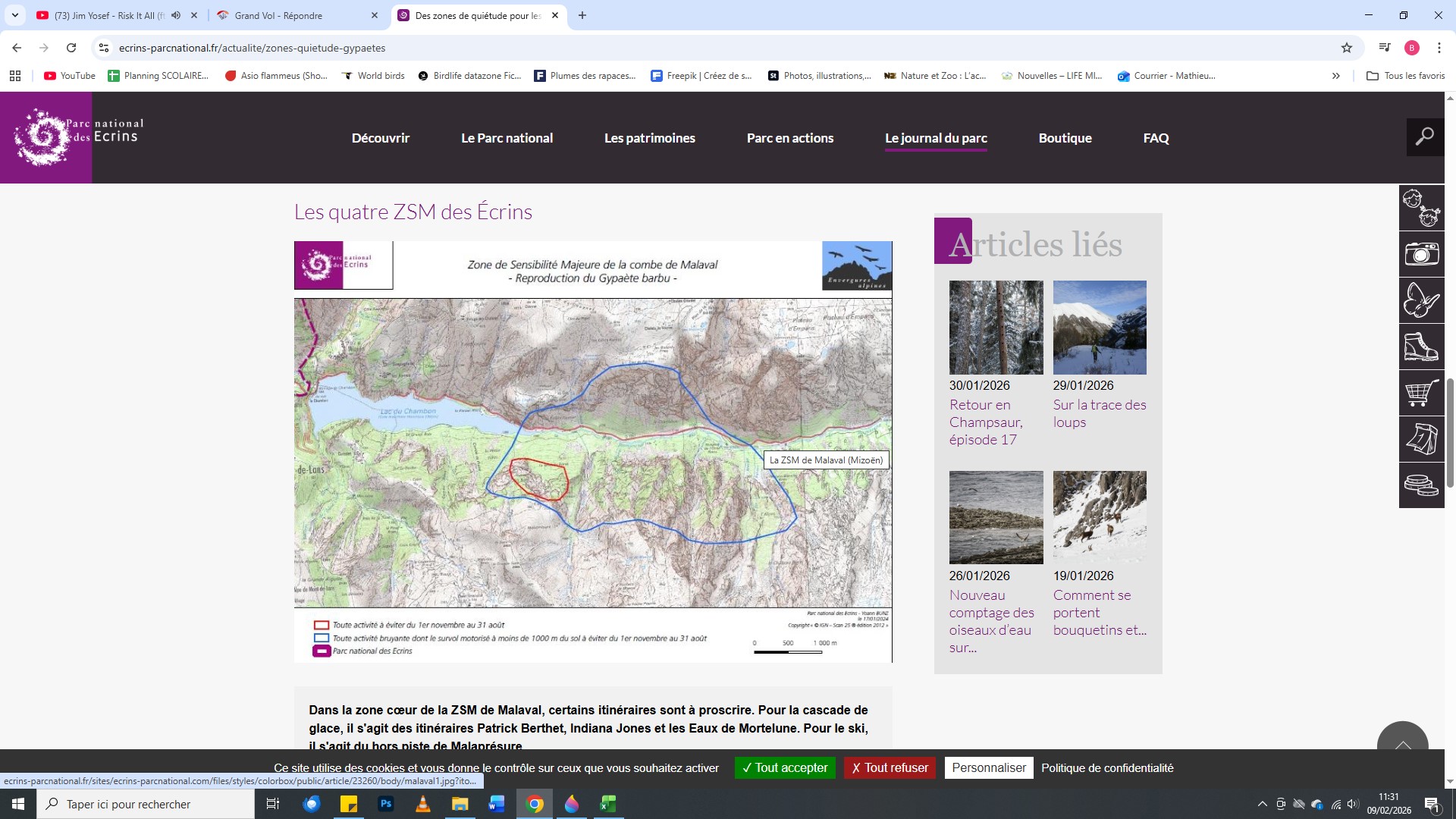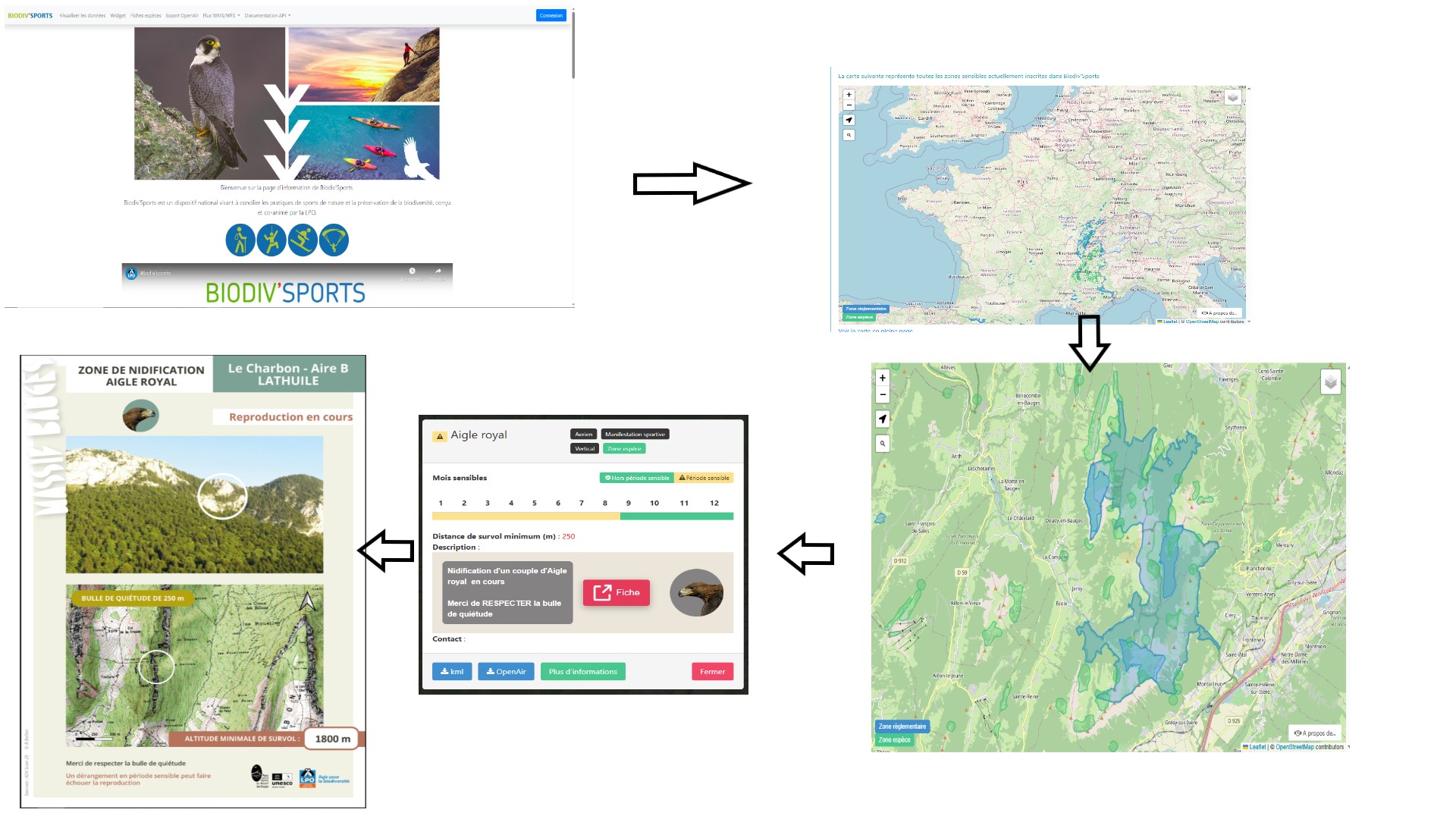 Sur ce site vous verrez les zones réglementaires et les zones espèces. En cliquant sur une bulle quiétude vous allez voir le statut (nidification en cours etc.). Vous aurez un visuel sur le période de sensibilité et également quelles types d'activités (terrestre, aerienne, verticale , rassemblement ect....) sont impactées par la bulle en question.