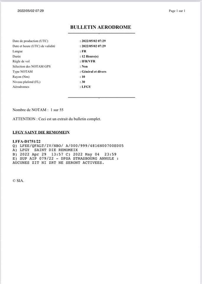 Le BEP Nord-Est nous informe de l’annulation du SUP AIP 079/22 DPSA STRASBOURG (cf NOTAM d’annulation ci-joints) qui sera retiré de la publication du SIA le 4 mai 2022. Seule la ZIT PFUE (SFC/FL115) sera activée le 9 mai 2022 conformément au NOTAM R1108-22 ci-joint.