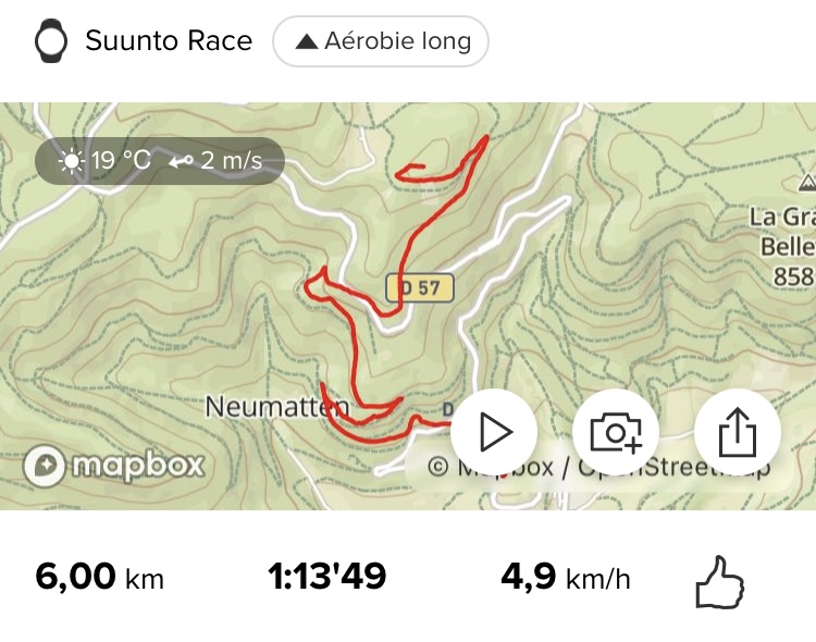 Pour preuve que le chemin fléché ne prend pas plus de temps voilà deux de mes traces. Durée identique, la différence est le passage au mamelon qui tape fort dans les cuisses et où je perd du temps ( ou alors je m’y prend mal ? )