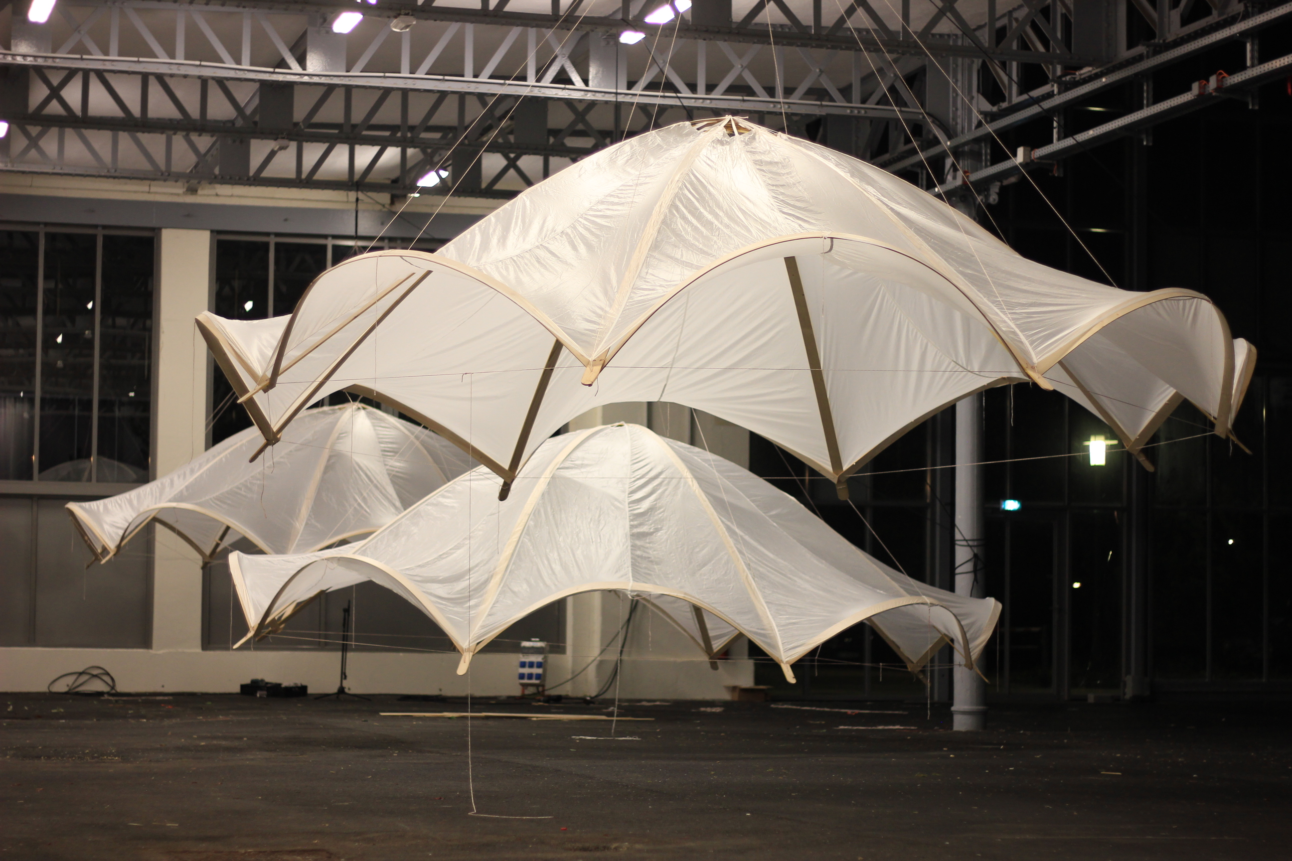 Il y a environ un an j’ai été contactée par cet artiste de Nancy, Eddy Tisserand, qui récupérait des voiles et des suspentes pour créer des œuvres. Alors on lui a envoyé les vieux secours école qui traînaient au local. Et voilà le résultats en luminaires.